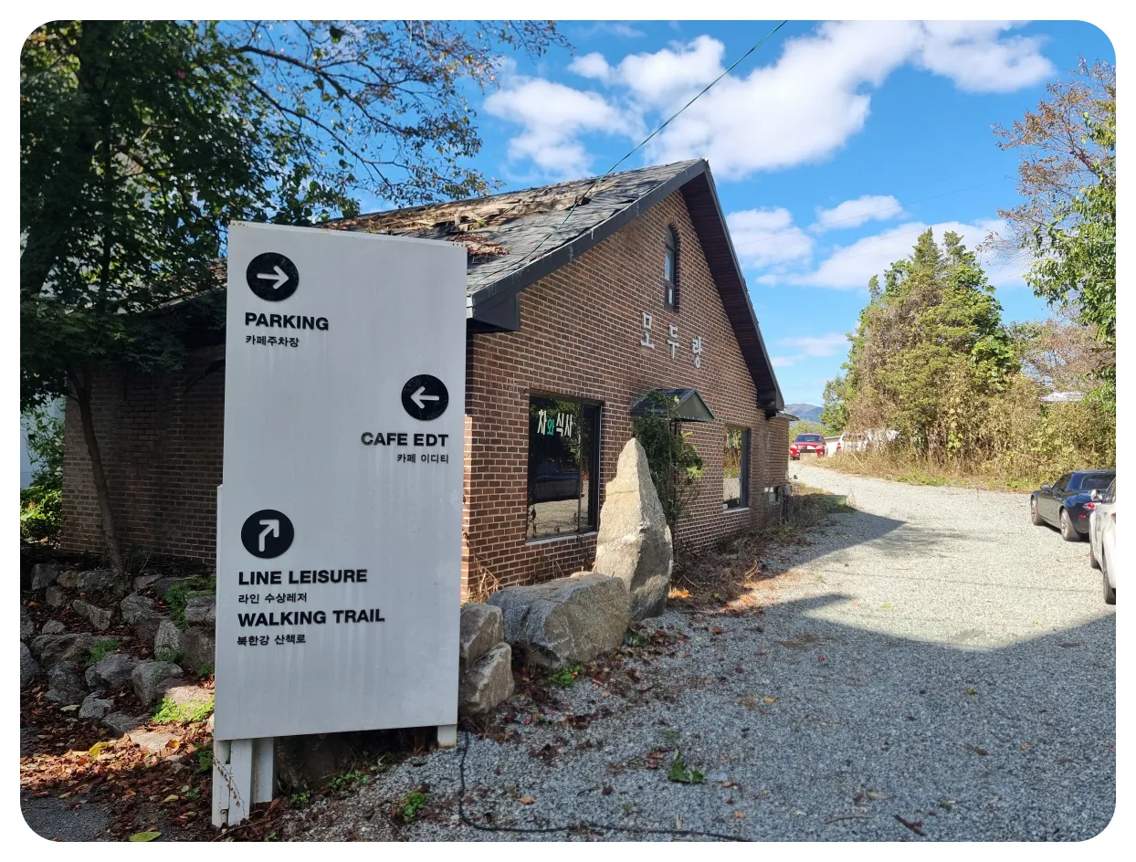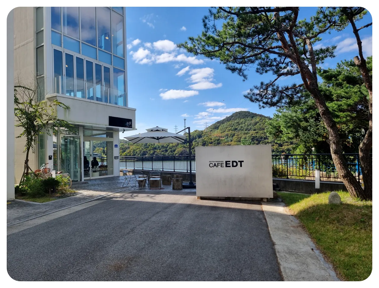 주차를 하고 내려오시면 북한강이 보이는 쪽에 목적지인 가평 분위기 맛집 카페 EDT가 보이실 거예요. 매장 앞에도 이름이 크게 보이기 때문에 찾으시기에 어려움 없으실 거고 쉽게 앞으로 쭉 걸어오시면 카페가 보입니다.