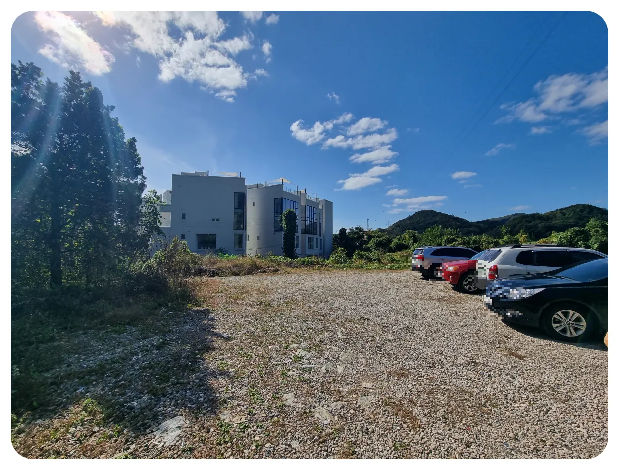 위쪽으로 올라오시면 해당 사진처럼 여유 있는 공간들이 준비가 되어있어서 주차하시기에는 불편함 없이 가능하실 거라 생각이 들었습니다. 다만 주차 선이 조금 잘 안 보여서 옆 차들과 공간 너무 좁지 않게 주차하시면 좋을 것 같아요. 저희가 방문했던 날은 평일 오후이기도 했지만 그래도 여유 있게 주차를 했었습니다. 아무래도 펜션 손님분들이 체크아웃하신 시간이라 조금 더 여유가 있었던 것 같아요.