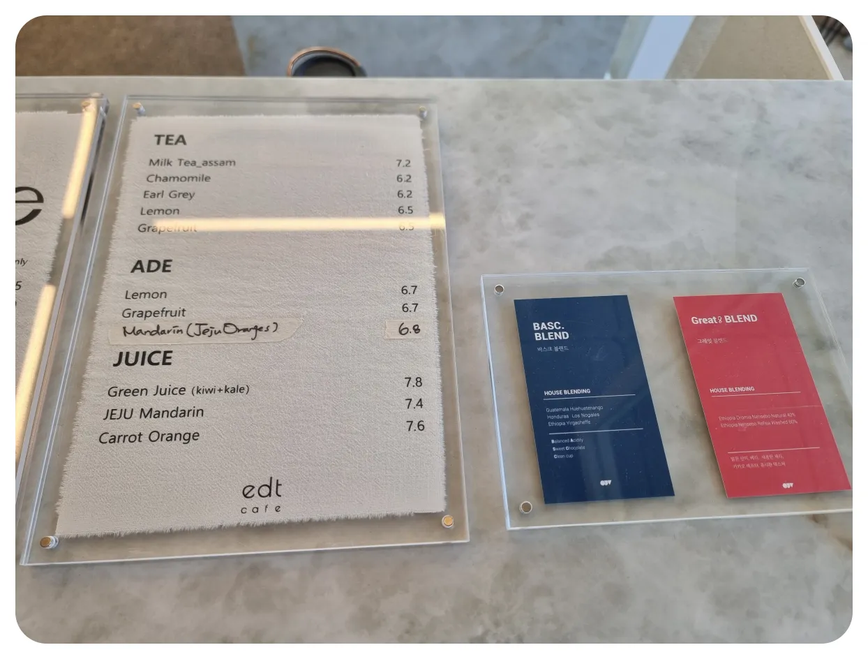 메뉴판은 해당 사진으로 보시면 편하게 확인이 가능하십니다. 저희가 주문한 메뉴는 시그니처메뉴 중 하나인 Brown(8,200원), 바닐라라테(7,500원) 이렇게 커피종류로 2종류 주문을 했습니다. 이곳 이디티에서도 커피 메뉴를 주문하실 때 원두선택이 가능하십니다. 옆에 있는 원두 설명을 보시거나 직원분께 추천요청드리면 친절하게 설명을 해주시니 참고하셔서 주문하시면 좋을 것 같아요.