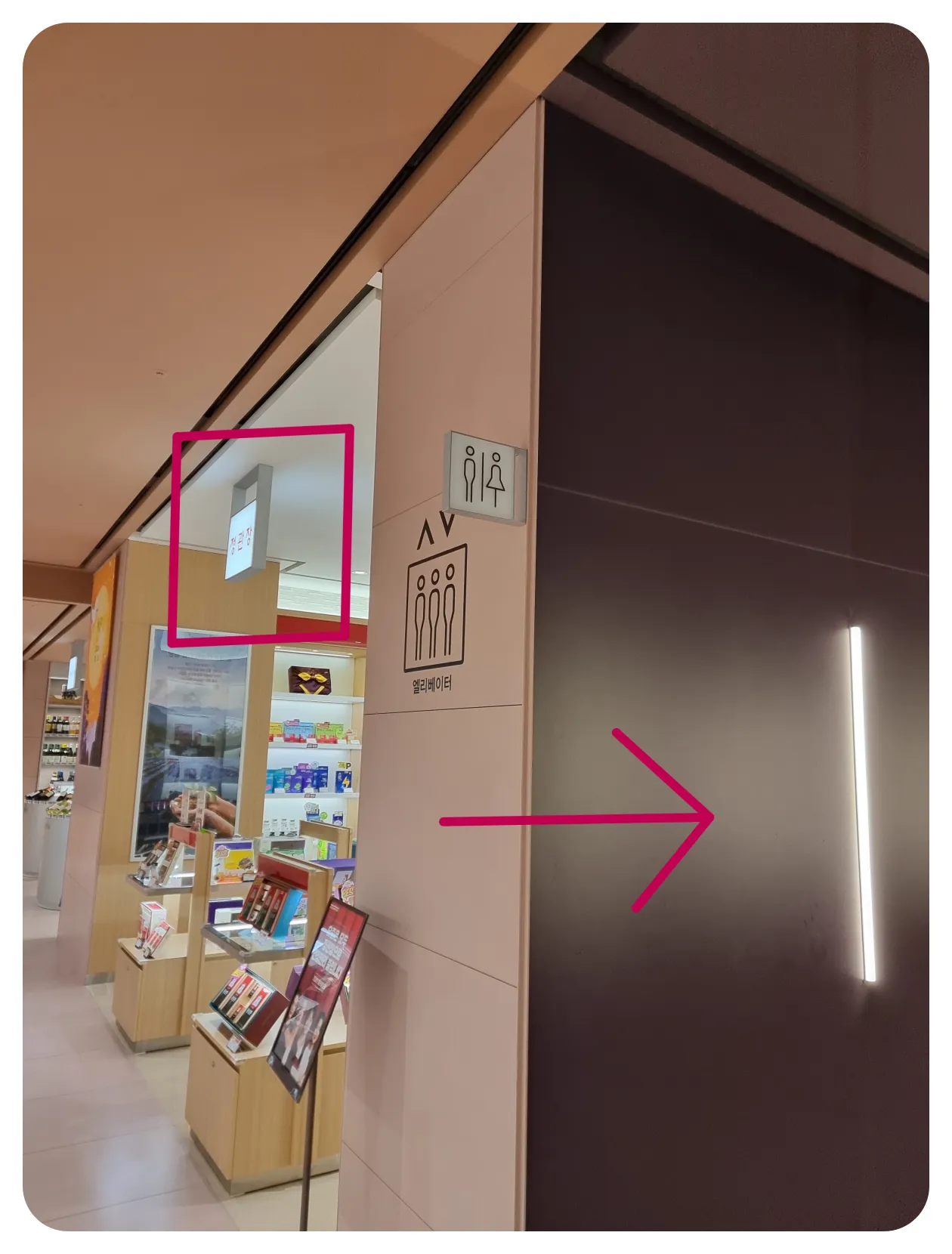 화장실 표지판 또는 엘리베이터 표지판을 보시고 오는 것도 또 하나의 방법으로 말씀드릴 수 있을 것 같아요