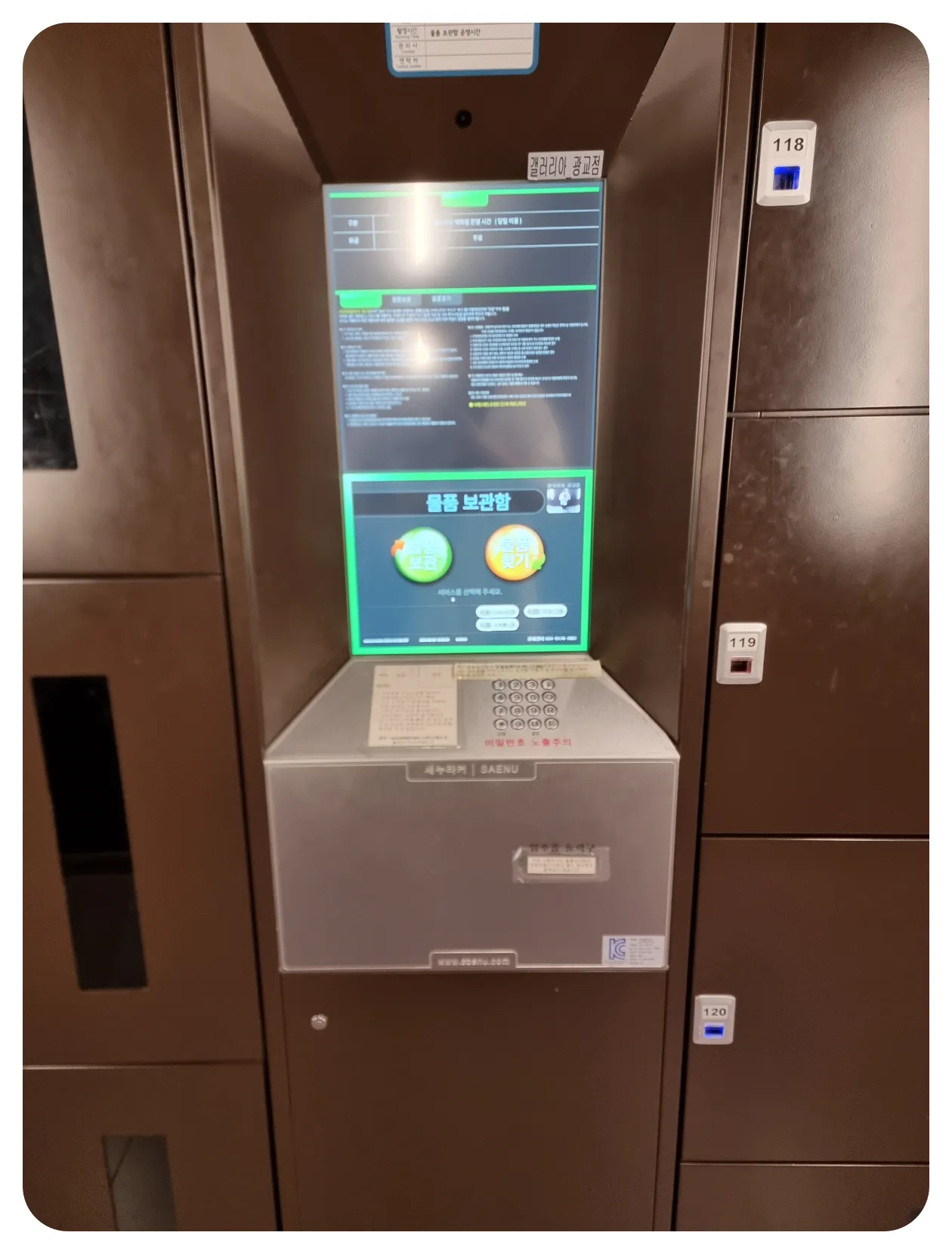 보관함 결제를 하는 장소도 말씀을 드려야겠죠 해당 키오스크 즉 해당 결제 장소는 물품보관함 중앙에 위치해 있어서 찾으실 때 큰 어려움 없이 바로 발견이 가능합니다 이곳에서 물품보관함에 관련된 정보와 결제를 진행하실 수 있습니다.