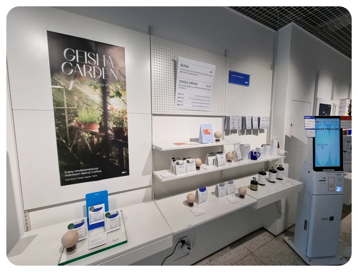 보시는 것처럼 주문할 수 있는 키오스크 양 옆에 다양한 매장 굿즈들이 준비가 되어있더라고요. 원두들은 물론 커피 추출 도구들 및 이것저것 다양한 물품들이 있어서 구경하는 재미도 있었던 매장이었습니다. 이어서 키오스크에 있는 메뉴들 소개도 간략하게 진행해 보겠습니다.