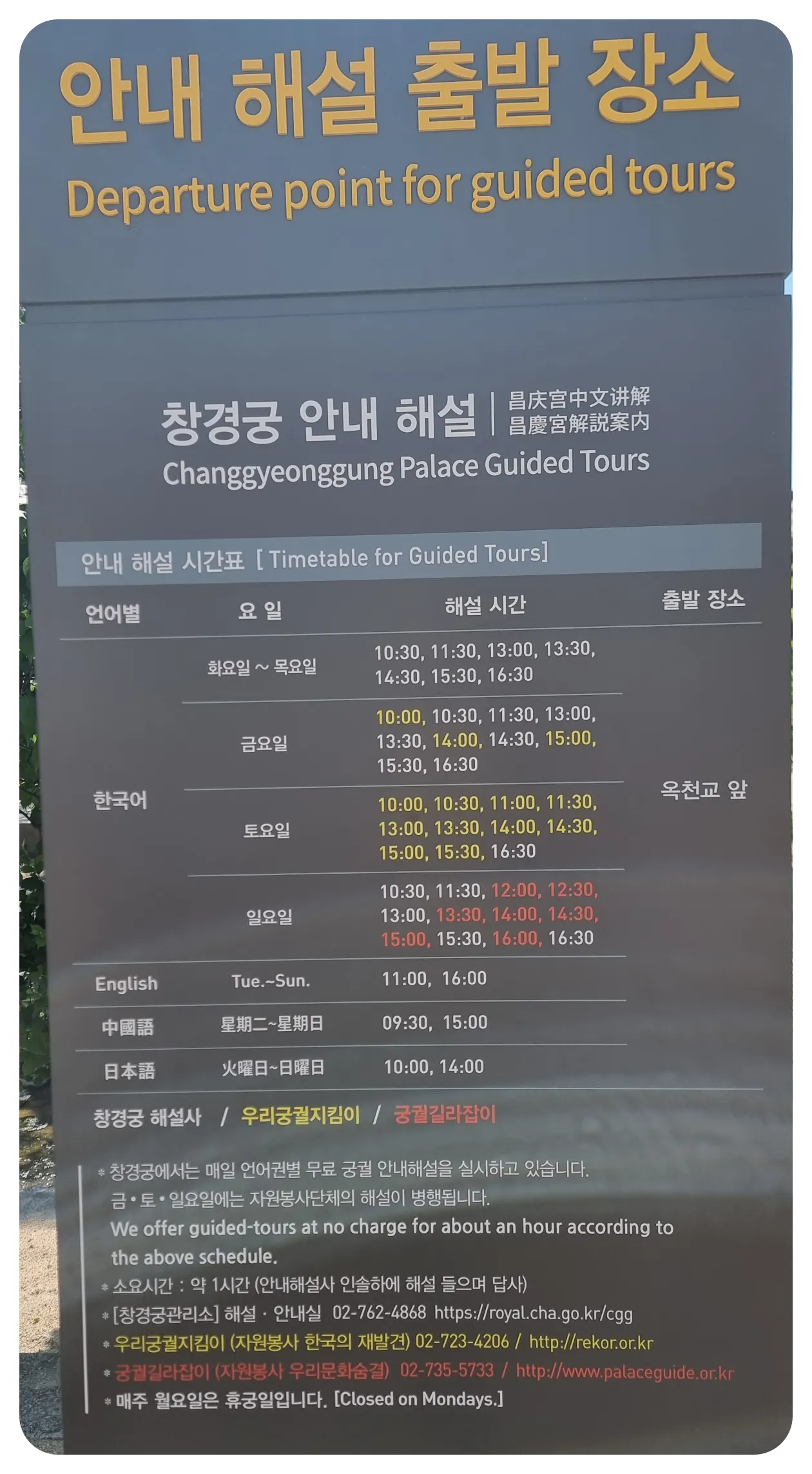 창경궁에서도 해설을 해주시는것 같더라구요! 각 요일별로 그리고 시간별로 출발장소 참고하셔서 안내해설 들어보시는것도 아이들과 함께 체험하기에 좋을것 같습니다