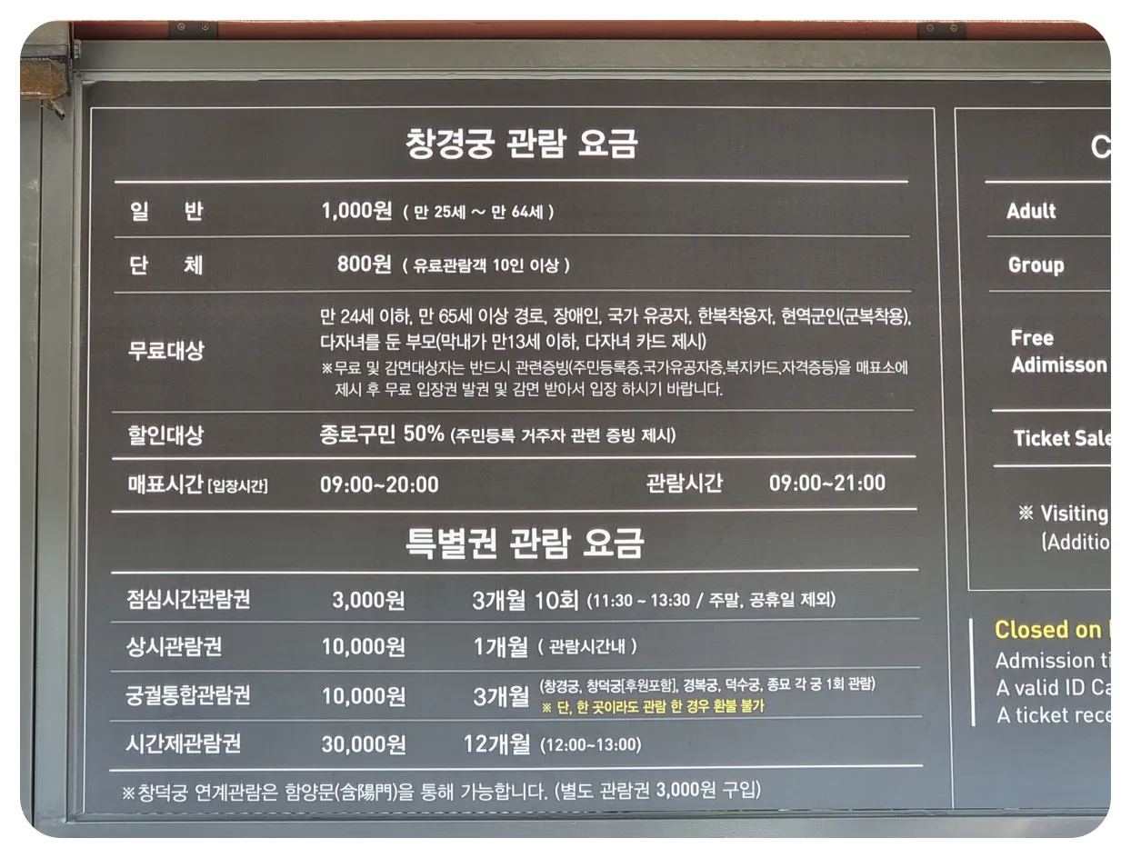 종로구민: 50% 할인 (주민등록증 등 거주 증명 필수)