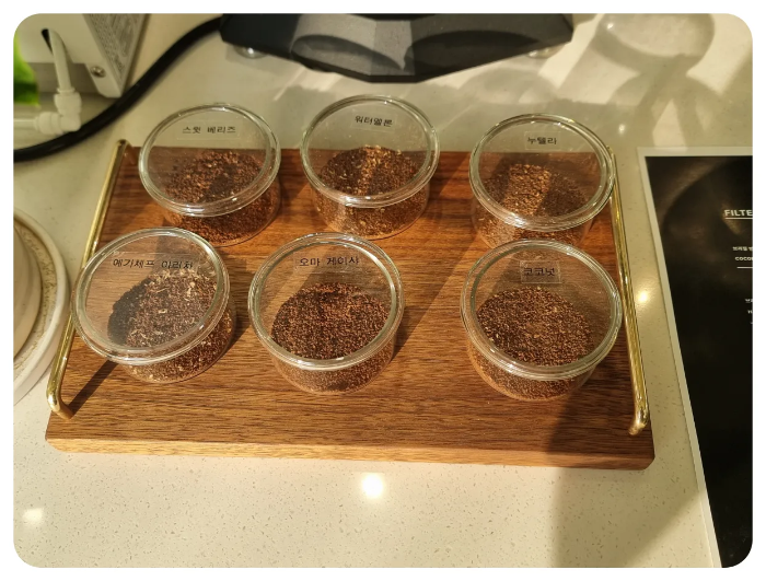 이렇게 필터커피 메뉴판 옆에는 해당하는 원두를 갈아놓은 그라인딩한 샘플을 준비하셨고