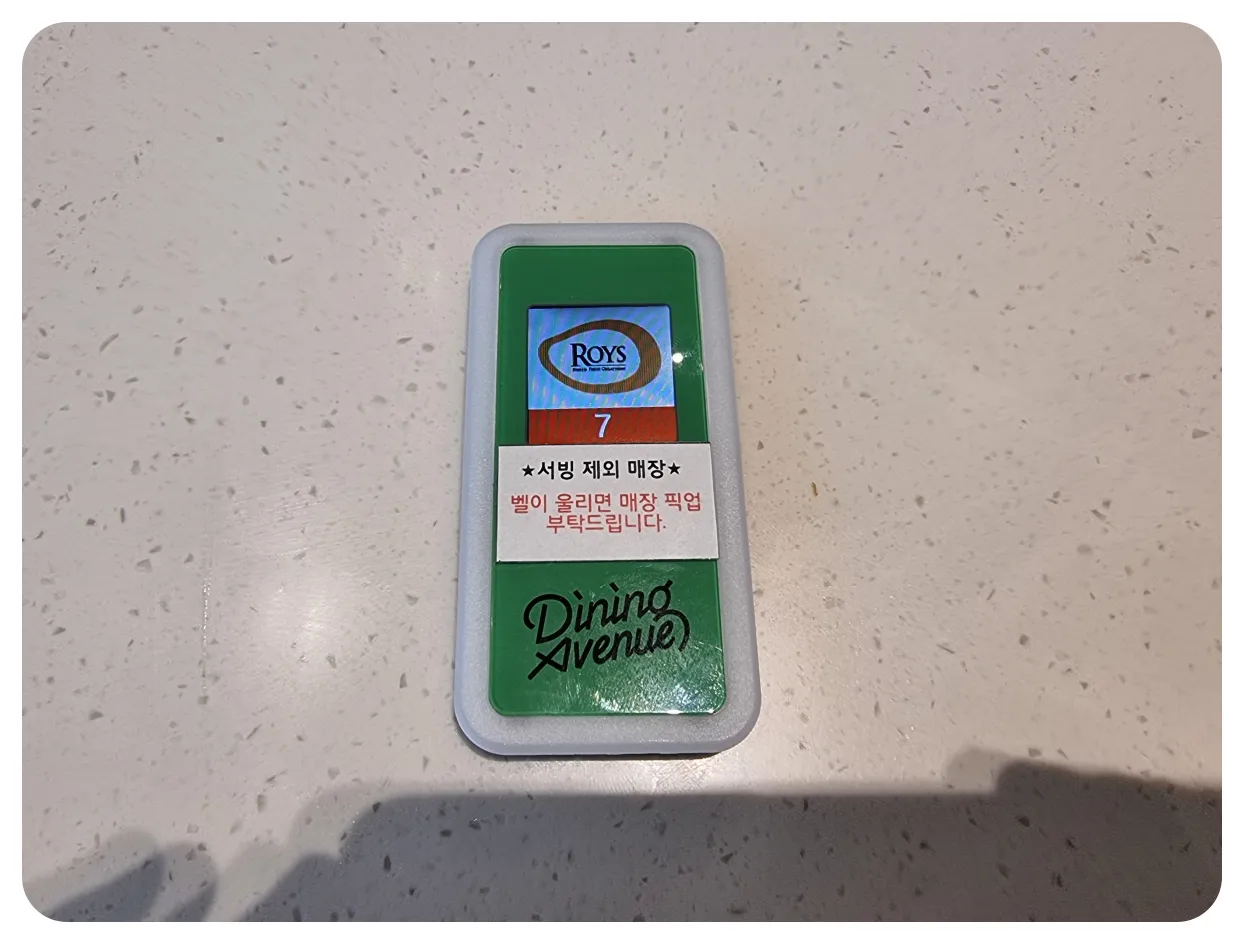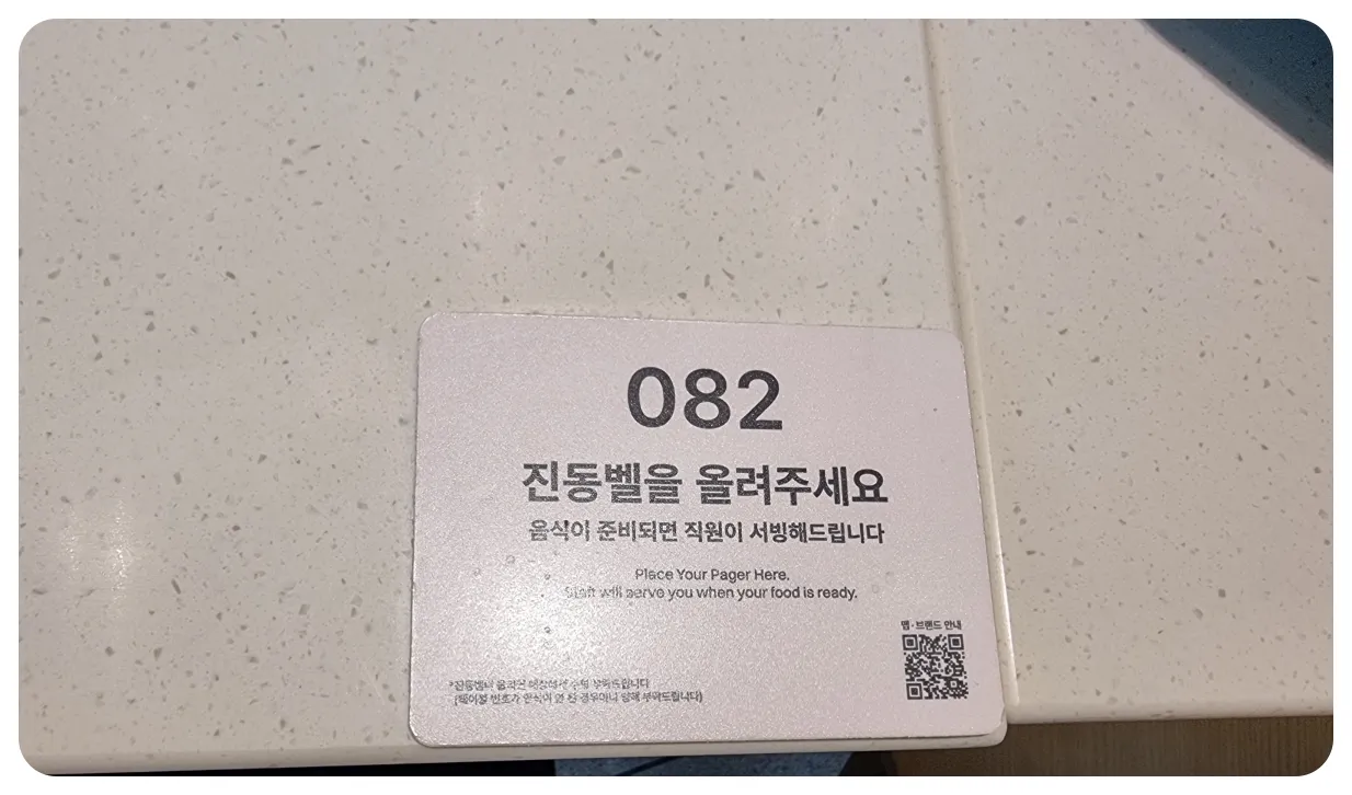 해당 그림처럼 문구 위에 진동벨을 올려두면 기다리시면 됩니다. 하지만 진동벨에 서빙제외매장 이라는 문구가 붙어있다면 테이블 색상에 관계없이 기존처럼 직접 가셔서 음식을 받아오시면 됩니다 이점 꼭 기억해주셔서 계속 기다리시는 그러한일이 없기를 바라겠습니다.
