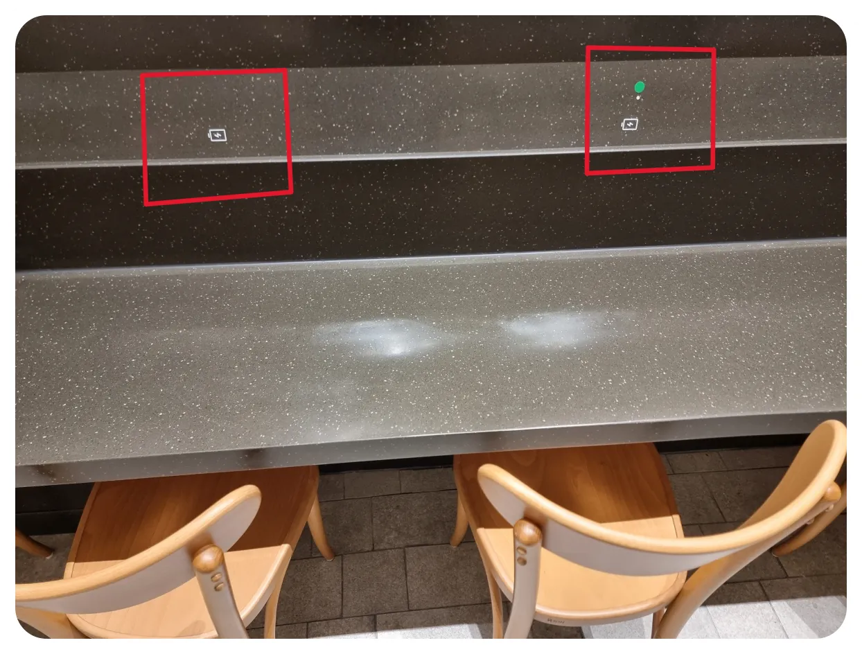 제가 표시해둔 위치에 보시면 충전 마크가 있는데 해당 자리에 핸드폰을 올려두시면 무선충전이 시작이 됩니다 아마 매장앞에있는 테이블들만 해당 충전기가 있는것 같아요 물론 핸드폰이 무선충전을 지원하는 모델이어야 가능할거라 생각을 합니다 해서 음식 기다리면서 충전을 하실수도 있고 영상 보시면서 식사하실때 배터리 충전을 같이 진행하면서 식사를 진행하시면 좋을것 같습니다!