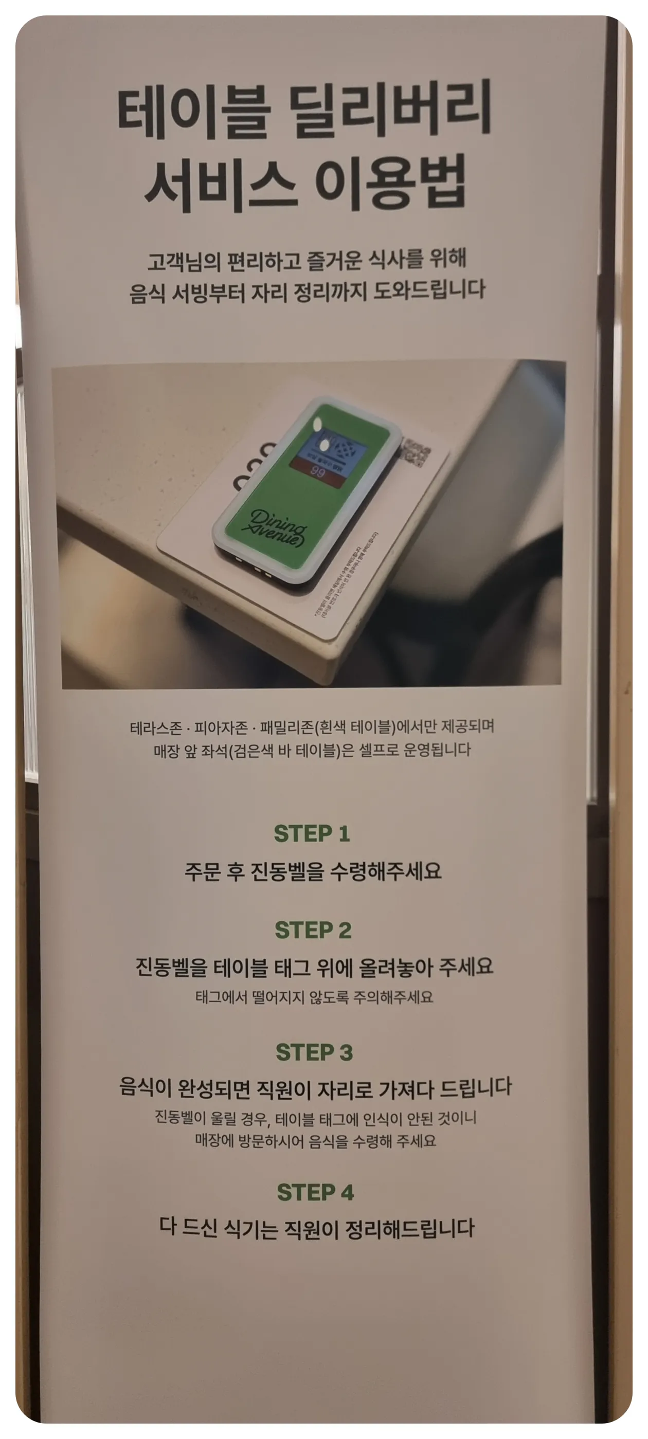 - 음식이 준비되면 직원이 자리로 가져다드립니다. 진동벨이 울리면 테이블 태그에 인식되지 않은 것이니 매장에 방문해 음식을 수령해주세요.