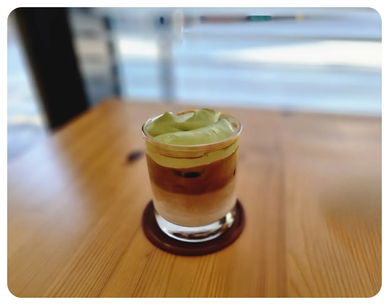 해당 커피를 받았을 때 처음 느낌은 크림이 아주 꾸덕하겠다는 생각이 들 정도로 크림 양이 넉넉하더라고요. 기대가 되는 메뉴였습니다. 한입 마셨을 때 커피와 함께 마셔지는 말차크림이 정말 조화롭게 느껴져서 어느 하나가 과하지 않다는 생각이 드는 시그니처메뉴 말차라테였습니다. 역시 시그니처라고 표현하신 이유를 알 것 같았던 메뉴였어요.