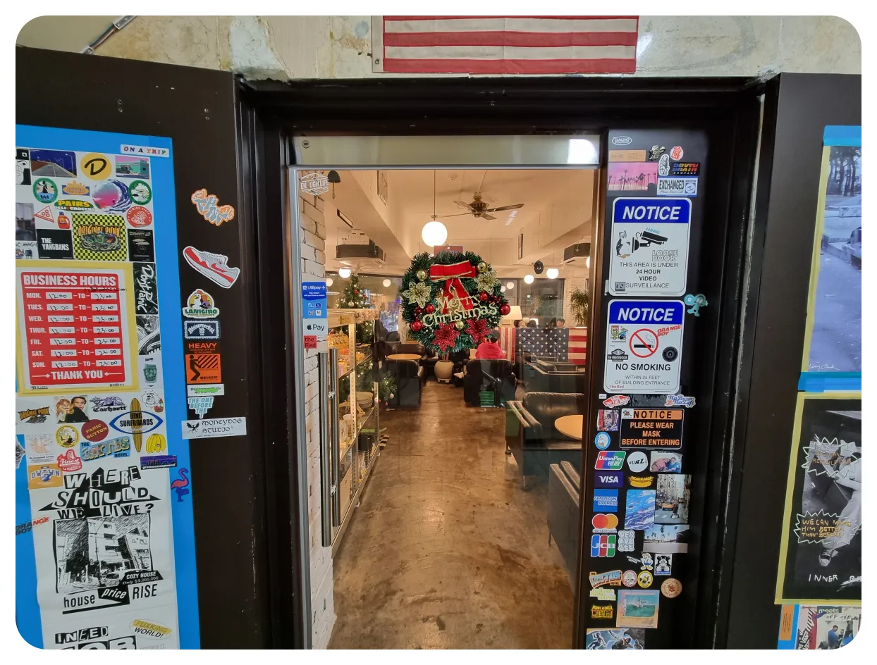 크리스마스를 앞두고 있어서인지 트리도 가장 먼저 눈에 보였고 앞선 사진에서도 문에 크리스마스 소품이 걸어져있더라구요 그리고 트리 옆에 보시면 이곳 홍라드에서 판매하는 굿즈들도 있어서 구경하는 재미도 있었습니다.