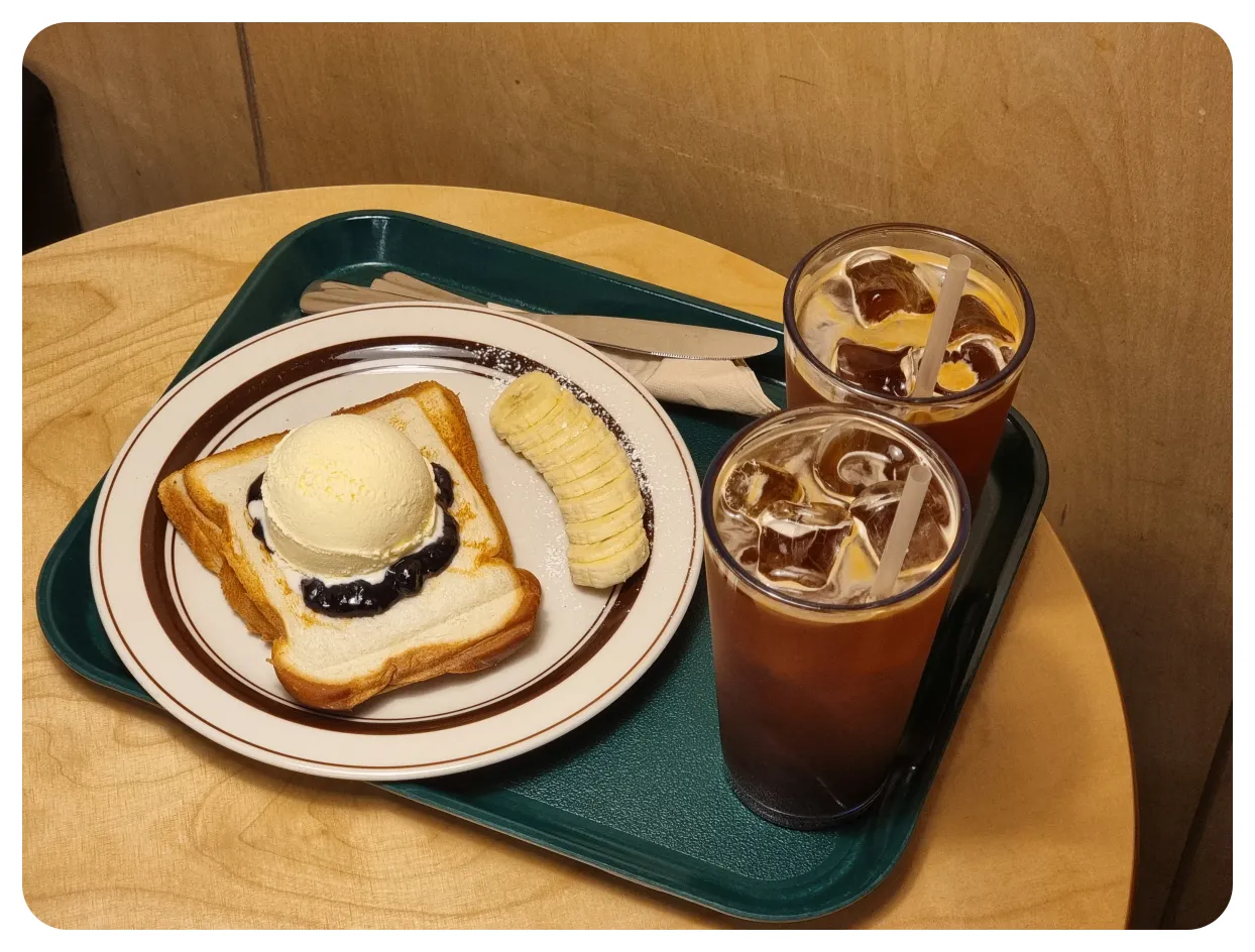저희가 주문한 메뉴인 디카페인 아메리카노 아이스 ( 5,000원 ) , 그리고 전남친토스트 ( 7,000원 ) 이렇게 메뉴를 받았습니다. 제가 이중에서 제일 기대했던 메뉴는 바로 전남친토스트! 맛이 정말 궁금했었습니다.