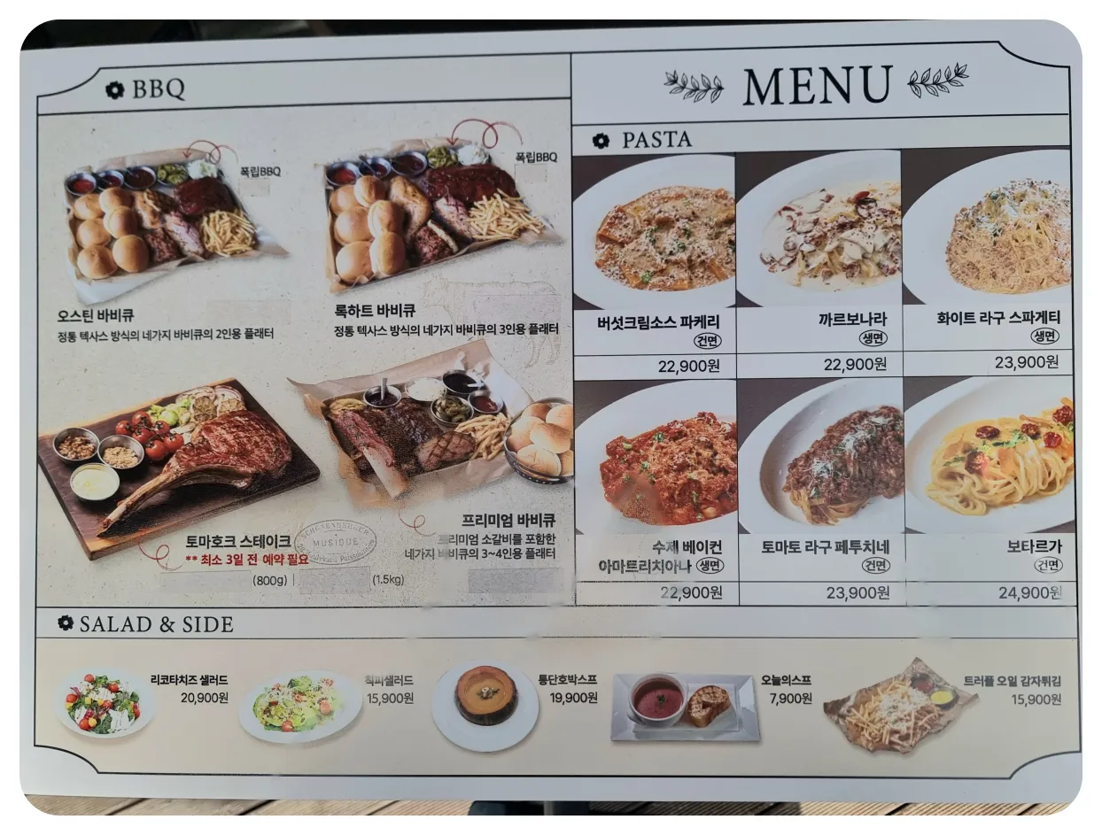 바로 BBQ 메뉴였습니다 모든 손님분들이 꼭 주문을 하시더라구요! 저희는 파스타 종류의