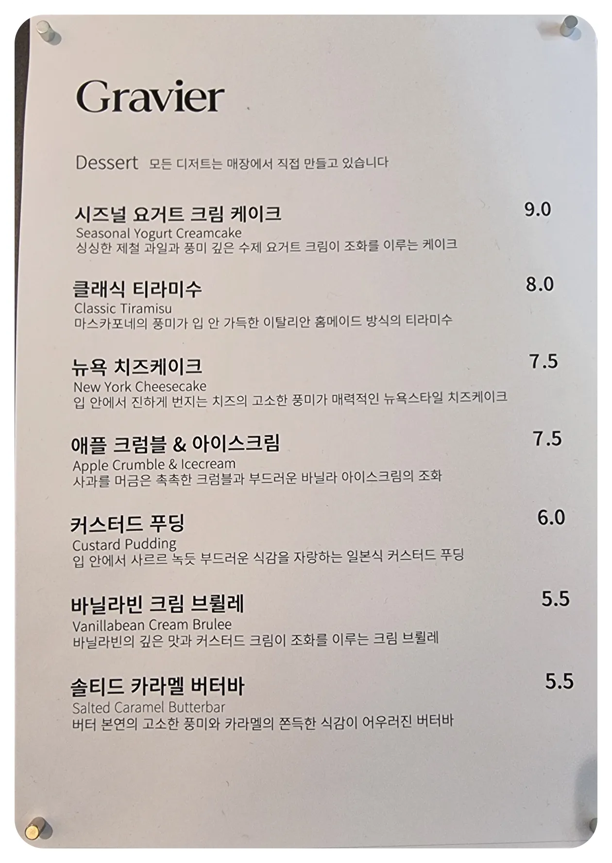 디저트 맛집으로 유명한 그라비에 메뉴판 소개입니다
