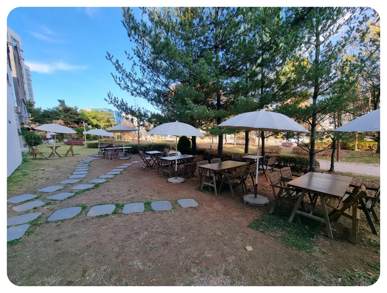 외부에는 테라스 자리가 마련이 되어있었습니다.은근히 많은 테이블들이 준비가 되어있더라고요 물론 겨울이 다가오고 있어서 밖에서 드시는 분들은 없으셨지만 봄, 여름, 가을 때 햇볕 좋게 들어오는 날에 바깥에서 앉아 커피를 마시면 정말 좋을 것 같아요 운치 있게 테라스자리도 꾸며놓으셨어요 뭔가 작은 정원 같은 그런 느낌이네요.