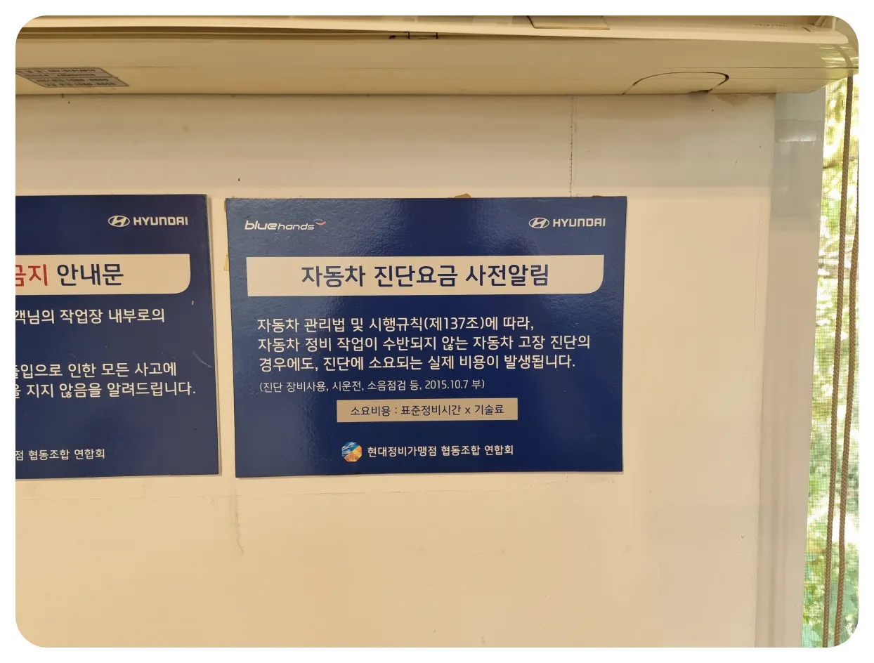 - 자동차 관리법 및 시행규칙(제137조)에 따라, 자동차 정비 작업이 수행되지 않는 자동차 고장 진단의 경우에도 진단에 소요되는 실제 비용이 발생합니다.