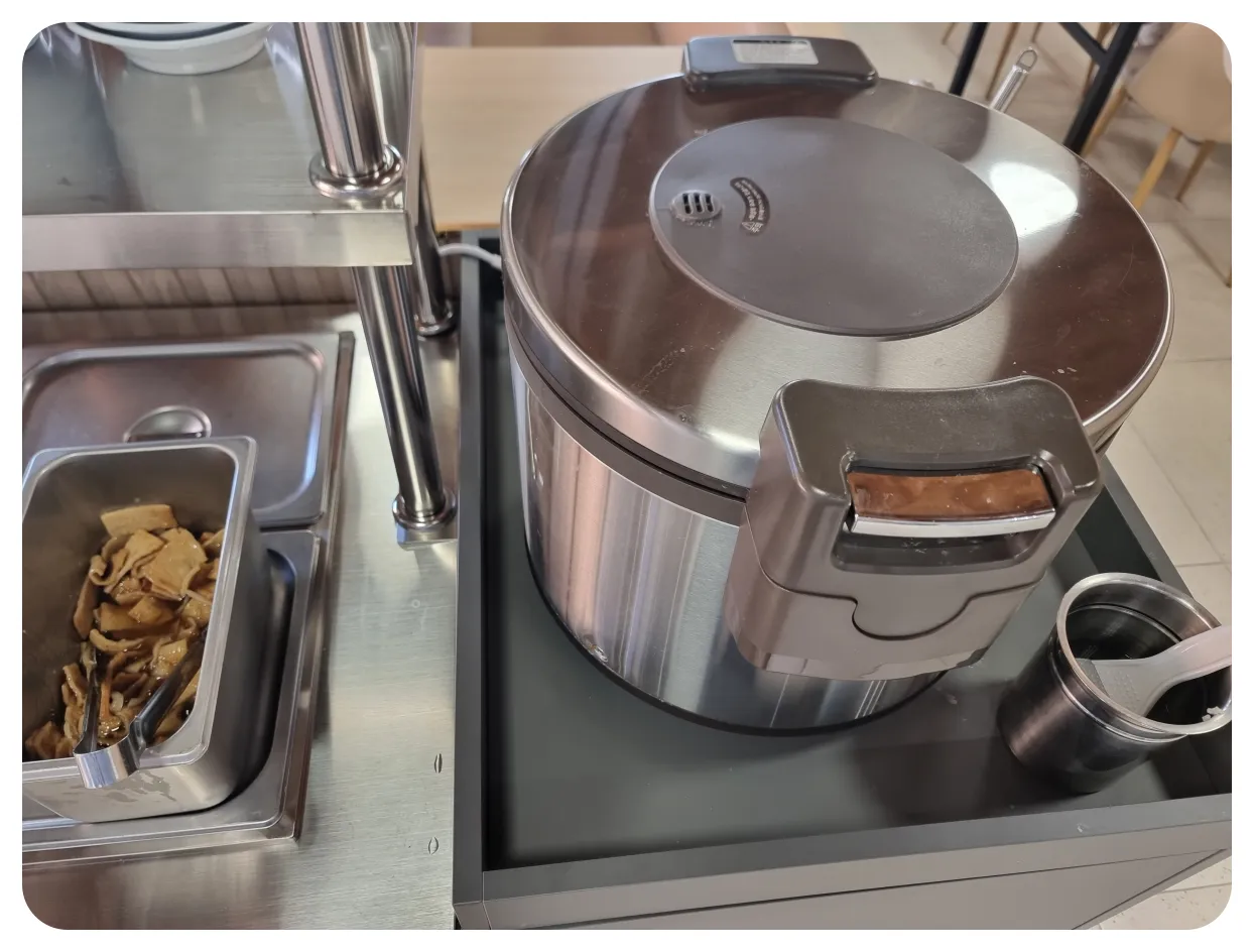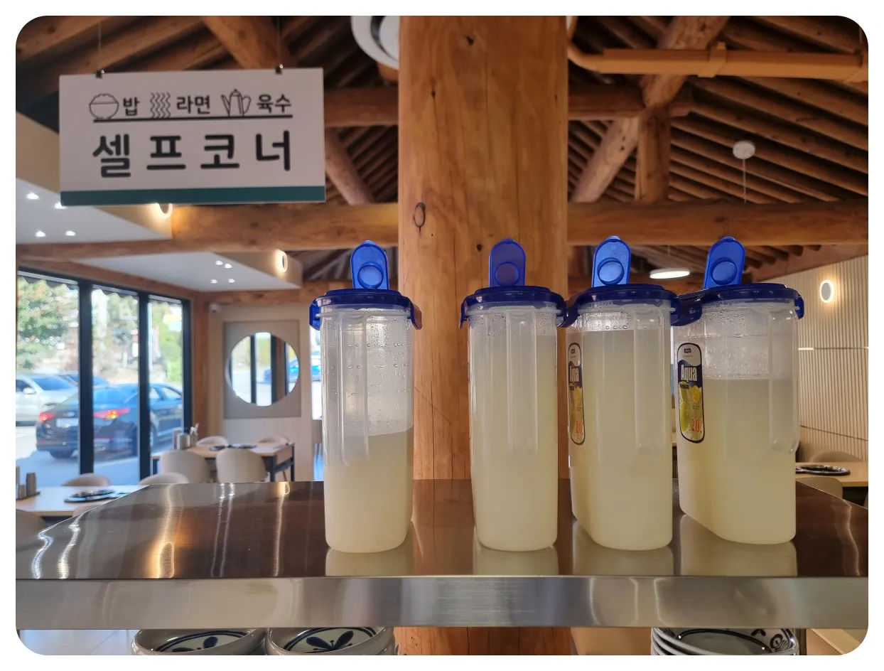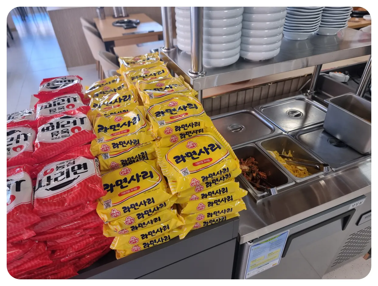 셀프코너에는 보시는 것처럼 육수와 라면사리 그리고 반찬들과 밥이 준비되어 있습니다.