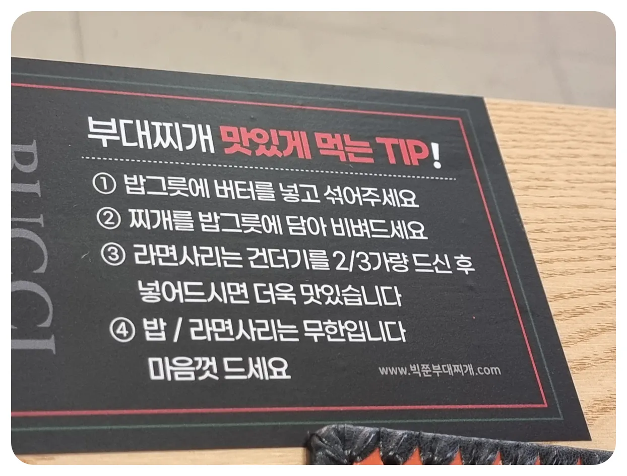 그리고 테이블에 부대찌개 맛있게 먹는 팁이 적혀있습니다.