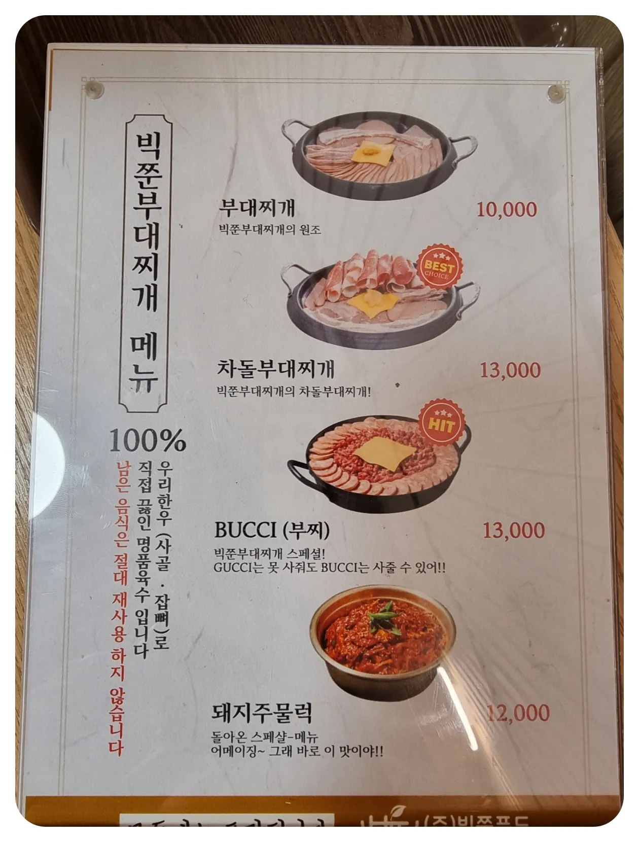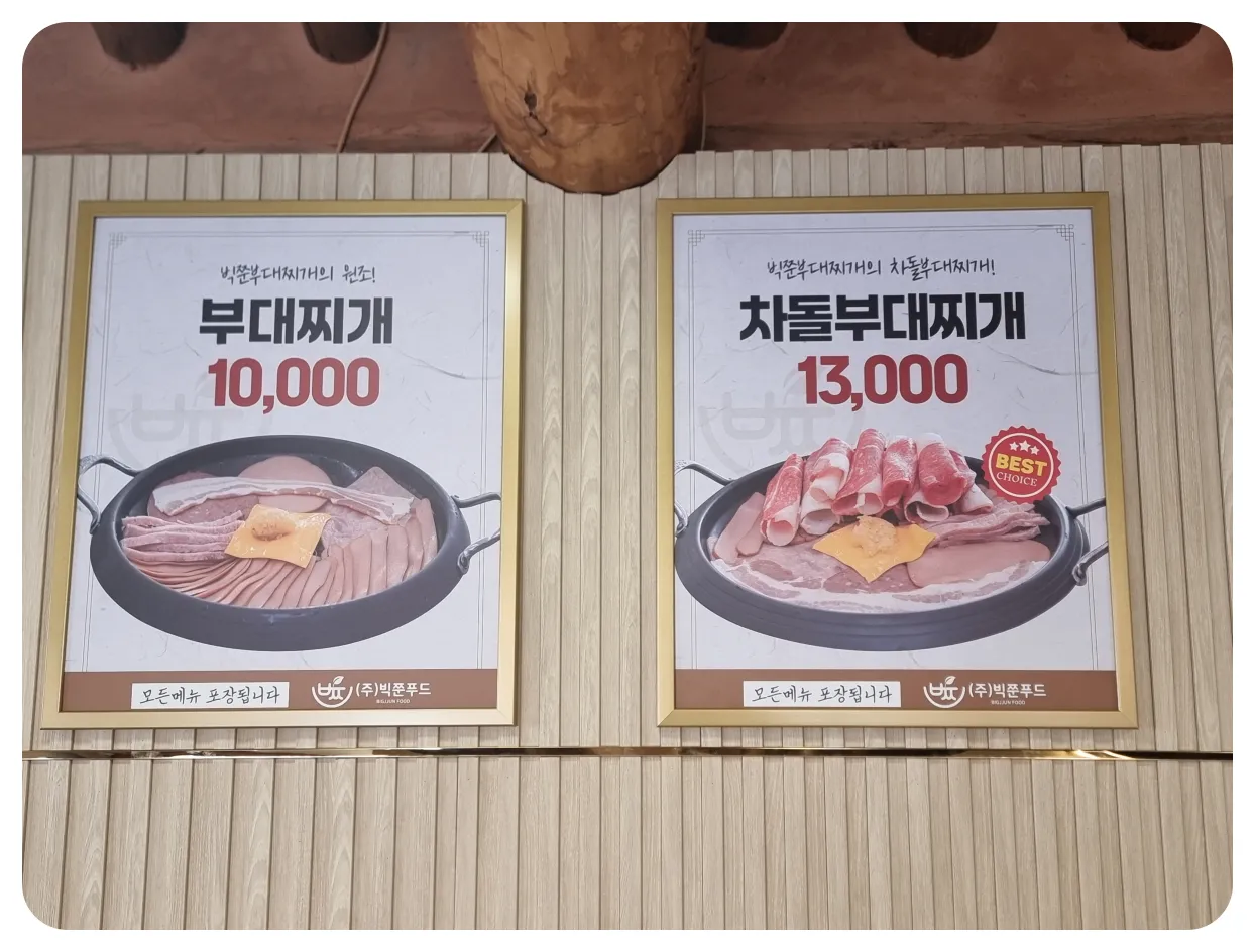 일반 부대찌개를 주문했었는데 보니까 다양한 메뉴들이 있더라고요. 그중에 제일 눈에 띄었던 거는 부찌였습니다. 설명을 보니 빅준부대찌개 스페셜 메뉴라고 하던데 비주얼부터 소시지와 햄이 아주 넉넉하게 들어가 있는 메뉴인 것 같아요.
