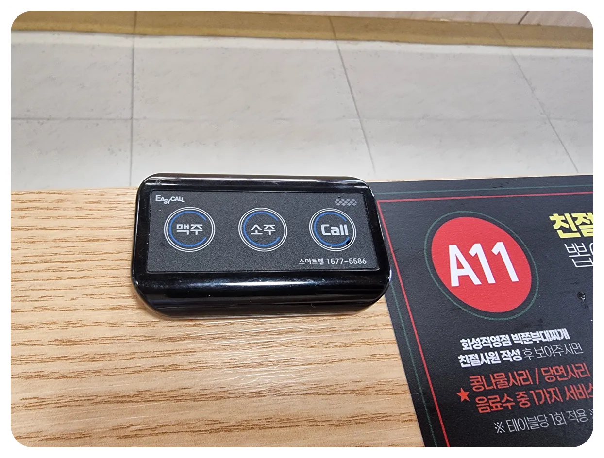 그리고 옆에 벨이 있는데 특이하게 맥주 소주 call 이렇게 세 가지로 나눠져 있더라고요. 저희는 술은 안 마셔서 이 2개는 눌러보진 않았는데 왠지 누르는 데로 주류를 갔다 주시는 것 같습니다.