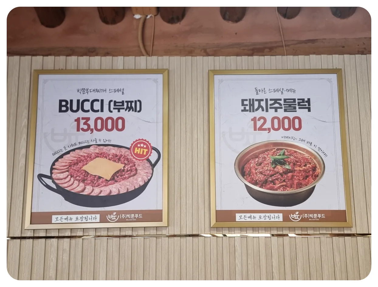 일반 부대찌개를 주문했었는데 보니까 다양한 메뉴들이 있더라고요. 그중에 제일 눈에 띄었던 거는 부찌였습니다. 설명을 보니 빅준부대찌개 스페셜 메뉴라고 하던데 비주얼부터 소시지와 햄이 아주 넉넉하게 들어가 있는 메뉴인 것 같아요.